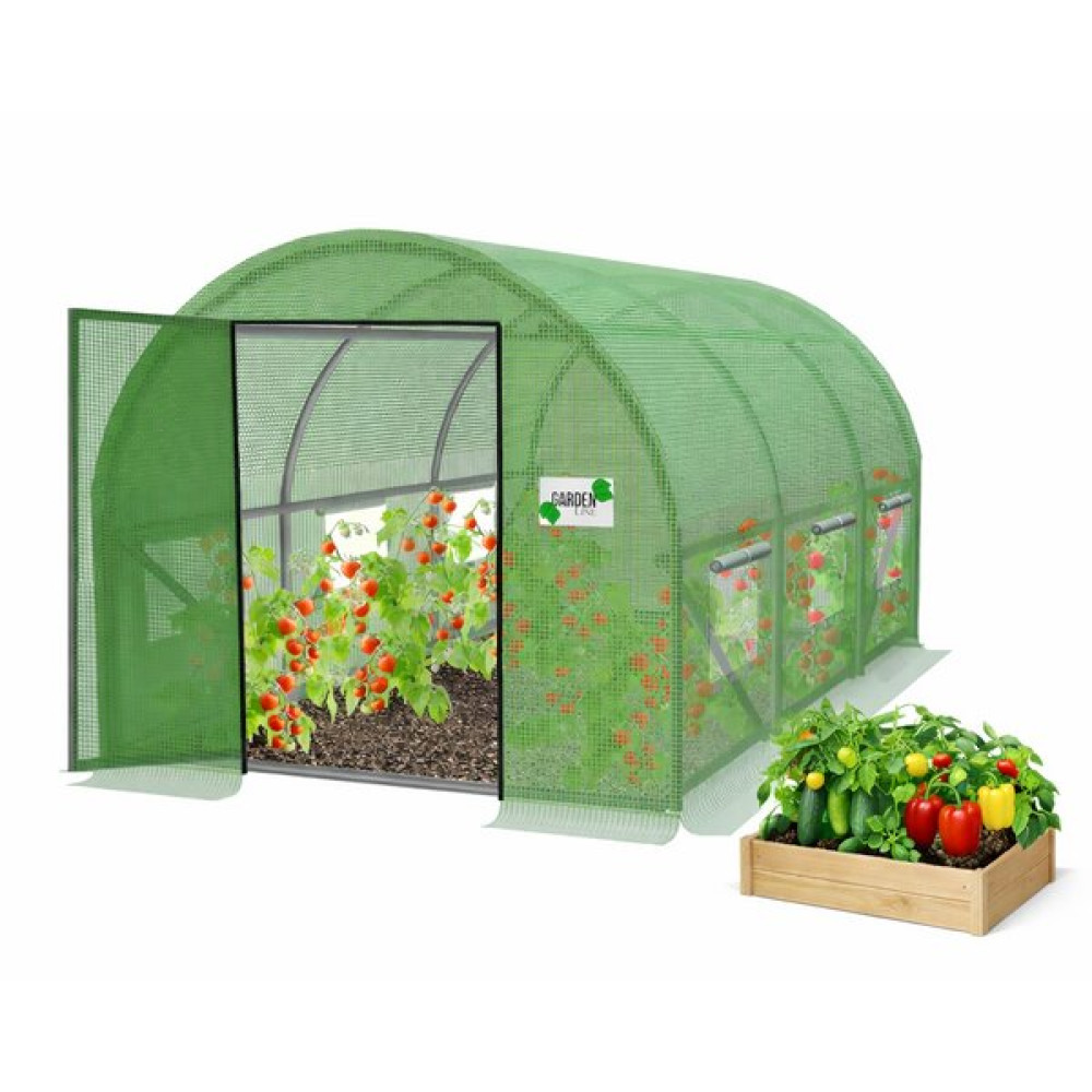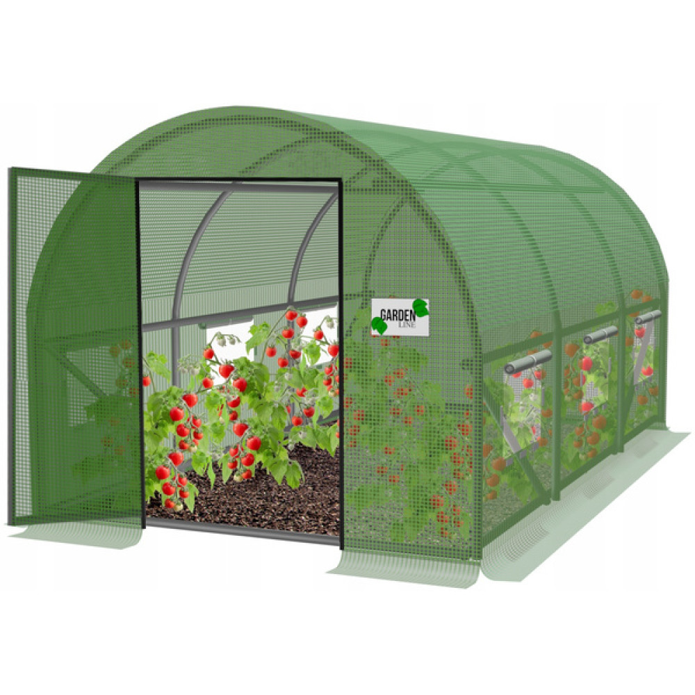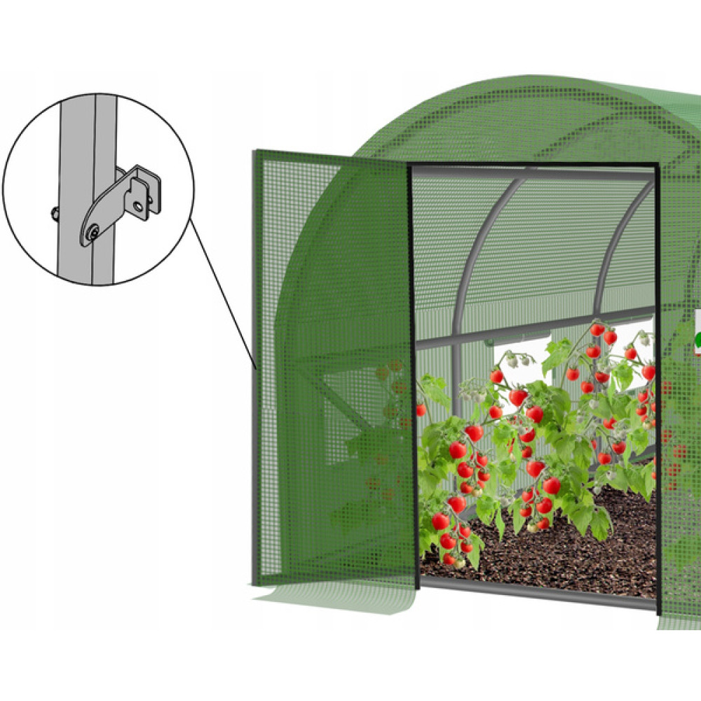 Vrata na tečajih omogočajo enostaven dostop brez težav z zadrgami, ki se pogosto poškodujejo, medtem ko stabilna konstrukcija dobro prenaša veter in dež. Vgrajena okna z mrežo proti insektom in vzdržljiva folija prispevajo k optimalni mikroklimi, dodatne cevi za plezalke pa olajšajo gojenje paradižnika, kumar, graha in drugih rastlin.