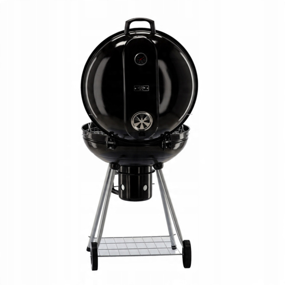 Ta vrtni žar je nepogrešljiva oprema za vsakega ljubitelja jedi z žara! Zahvaljujoč okrugli obliki, pokrovu in priročnim kolesom je žarjenje ne le okusno, temveč tudi udobno in prijetno. Namenjen je pečenju na oglje, emajlirano kurišče in pokrov z vgrajenim termometrom pa zagotavljata popolne rezultate. Velika kromirana rešetka in posoda za pepel poskrbita za red in udobje pri vsaki uporabi.