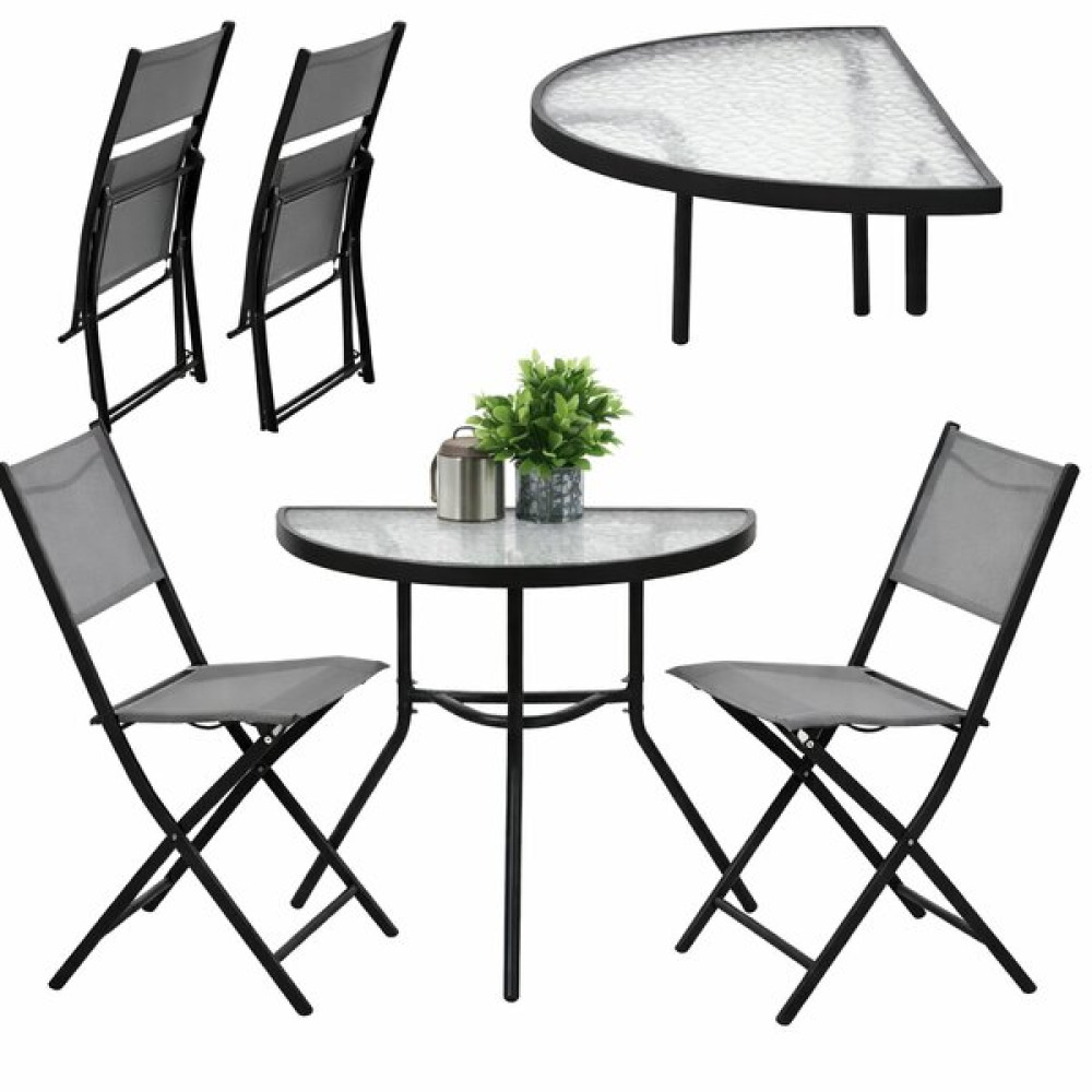 V svoj vrt ali na teraso vnesite stil, udobje in praktičnost, tudi kadar imate na voljo manj prostora. Ta eleganten komplet Garden Line združuje klasično obliko z moderno funkcionalnostjo, zato je idealna izbira za vse, ki iščejo prostorsko varčno, a hkrati prefinjeno rešitev. Polmesečna miza se popolnoma prilega ob steno, zložljivi stoli pa zagotavljajo udobje in enostavno shranjevanje, kar omogoča ustvarjanje harmoničnega in elegantnega kotička za sprostitev.